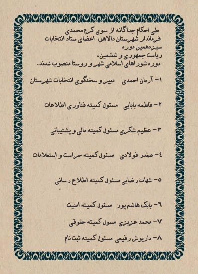 طی احکام جداگانه از سوی کرم محمدی فرماندار شهرستان دالاهو، اعضای ستاد انتخابات سیزدهمین دوره ریاست جمهوری و ششمین دوره شوراهای اسلامی شهر و روستا منصوب...