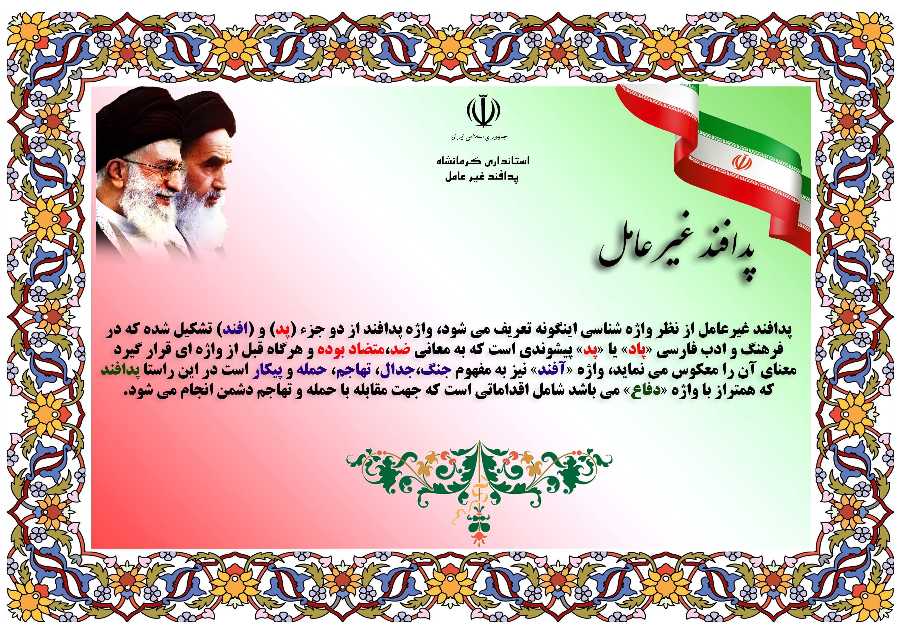 پدافند غیرعامل از نظر واژه شناسی اینگونه تعریف می شود، واژه پدافند از دو جزء (پد) و (افند) تشکیل شده که در فرهنگ و ادب فارسی «پاد» یا «پد» پیشوندی است که به معانی ضد،متضاد بوده و هرگاه قبل از واژه ای قرار گیرد معنای آن را معکوس می نماید، واژه «آفند» نیز به مفهوم جنگ،جدال، تهاجم، حمله و پیکار است در این راستا پدافند که همتراز با واژه «دفاع» می باشد شامل اقداماتی است که جهت مقابله با حمله و تهاجم دشمن انجام می شود.