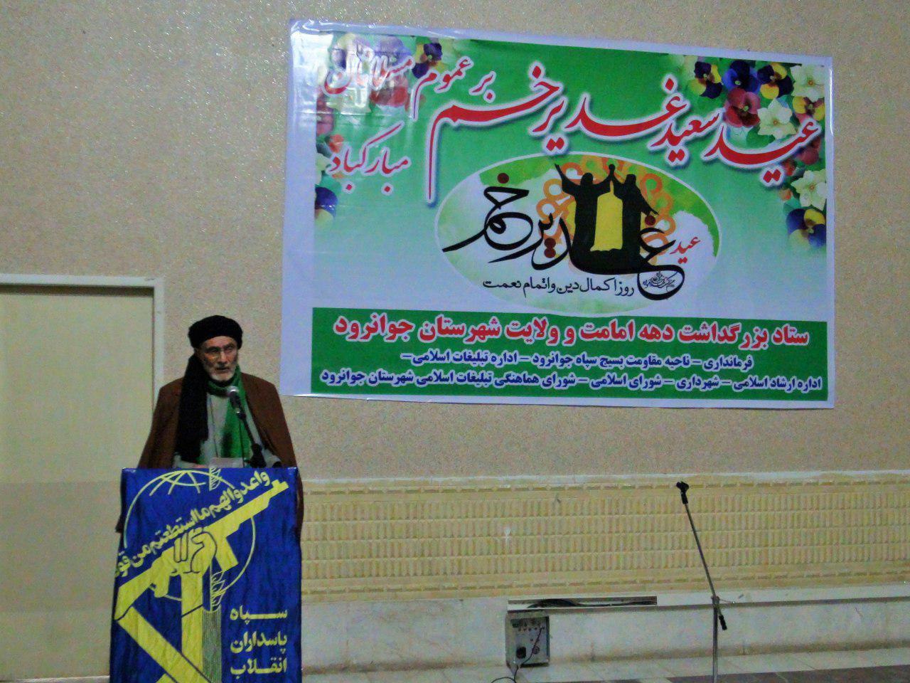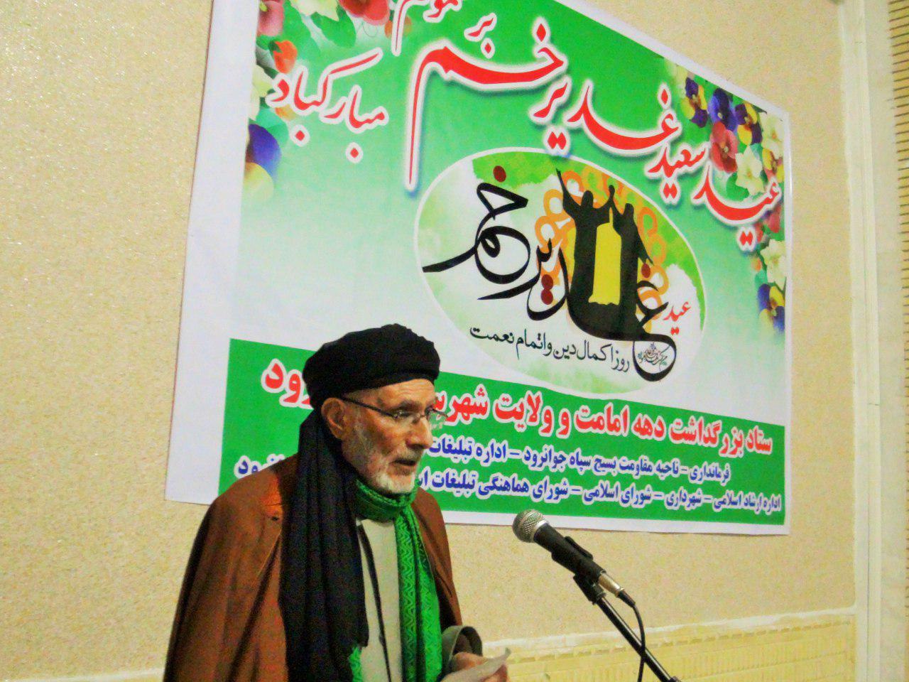 به گزارش روابط عمومی فرمانداری شهرستان جوانرود ، امام جمعه موقت جوانرود با تبریک عید غدیرخم گفت: غدیرخم واقعه تاریخی ومبارکی برای همه مسلمانان است. ماموستا ملا رستم حسینی با تشریح واقعه غدیر خم افزود: واقع غدیر از دیدگاه اهل تشیع به معنی ولایت وسرپرستی واز دیدگاه اهل تسن به معنای دوستی ومحبت حضرت علی (ع) است. وی اظهار داشت: اما هیچ یک از این دیدگاه ها از بزرگی و فضیلت حضرت علی (ع) کم نمی کند و هر دو دیدگاه به آن اعتقاد دارند و یک واقعه مبارکی است. امام جمعه موقت جوانرود خاطرنشان کرد : هر دو دیدگاه به فضلیت و برزگی حضرت علی (ع) اهتمام می ورزند .وی با بیان ویژگی حضرت علی (ع) یاد آورشد:علم وشجاعت ، صبروبردباری ، اخلاص درعمل تنها بخشی از ویژگی های آن حضرت است. مولودی خوانی ومسابقه فرهنگی واهدا اجوایز از دیگر برنامه این جشن بود .