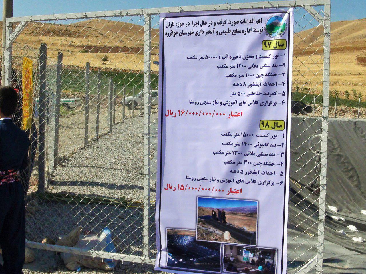 رئیس اداره منابع طبیعی و آبخیز داری شهرستان جوانرود در آیین افتتاح تور کینست (مخزن ذخیره آب ) و سازه سنگی مالاتی حوزه بازان هم گفت : این طرح با اعتبار 16 میلیارد ریال از محل صندوق توسعه ملی شامل مخزن ذخیره آب 50 هزار متر مکعبی ،خشکه ،بند سنگی ملاتی 1200 متر مکعبی ، خشکه چین هزار متر مکعبی و 8 دهنه آبشخور است.