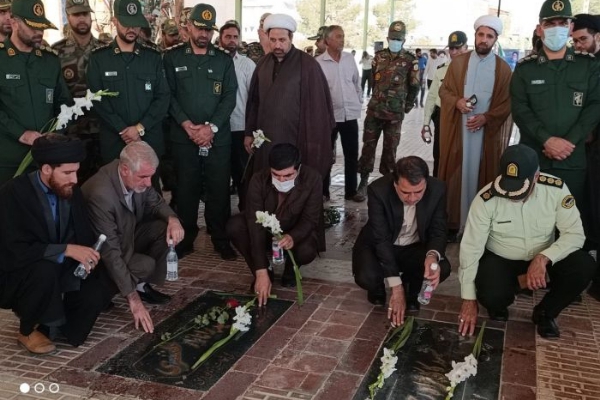 غبارروبی و عطر افشانی مزار شهدای حرم احمد بن اسحاق ره سرپل ذهاب در اولین روز از گرامیداشت هفته دفاع مقدس