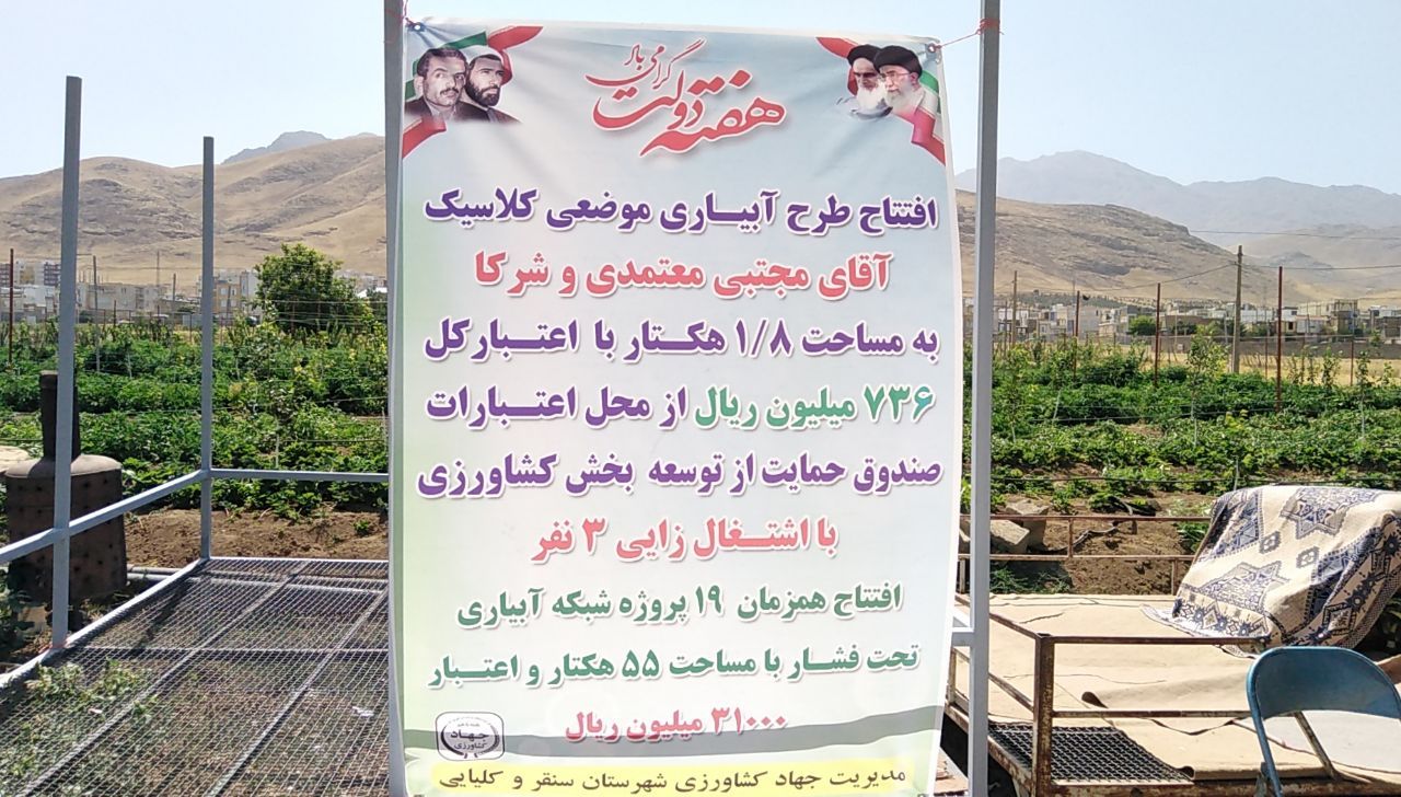 همچنین در ادامه برنامه ها ١٩ پروژه آبیاری تحت فشار با مساحت ۵۵ هکتار و ٣١ میلیارد ریال اعتبار و طرح آبیاری موضعی کلاسیک با مساحت ١.٨ هکتار و اعتبار بالغ بر ٧ میلیارد ریال و اشتغالزایی ٣ نفر افتتاح شد.