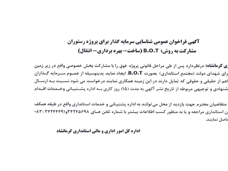 آگهی فراخوان نخست مناقصه عمومی یک مرحله ای